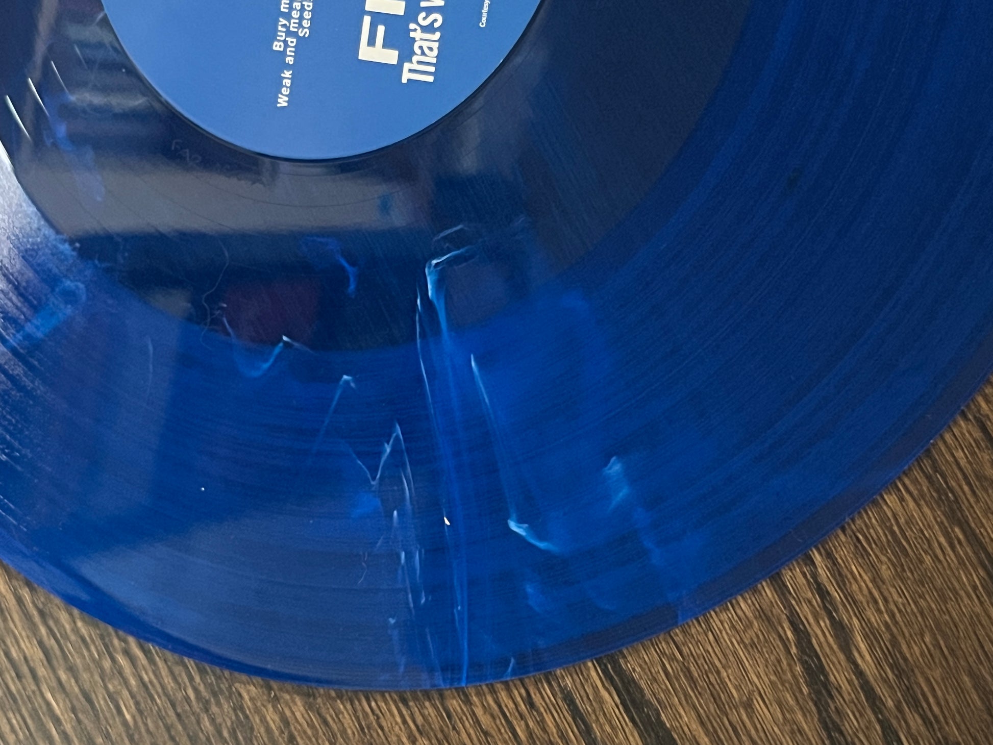 We received approximately 25 copies of That's What Love Songs Often Do on "transition" colors - meaning there is a little bit of other colors in the mix from before the blue vinyl fully took over on the press. So, we had the band sign them all! Needless to say they wrote a bunch of goofy stuff on the jacket. The actual LPs vary a bit - some just have a tiny bit of white or other colors, some are pretty mixed. Pictures are just an example of a random one pulled out - your copy may or may not look like this and you'll undoubtedly get different messages on the jacket.